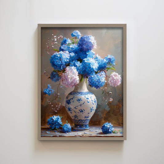 Hydrangea Flowers with Blue and White Porcelain Textured Art Print Wall Decor for Living Room